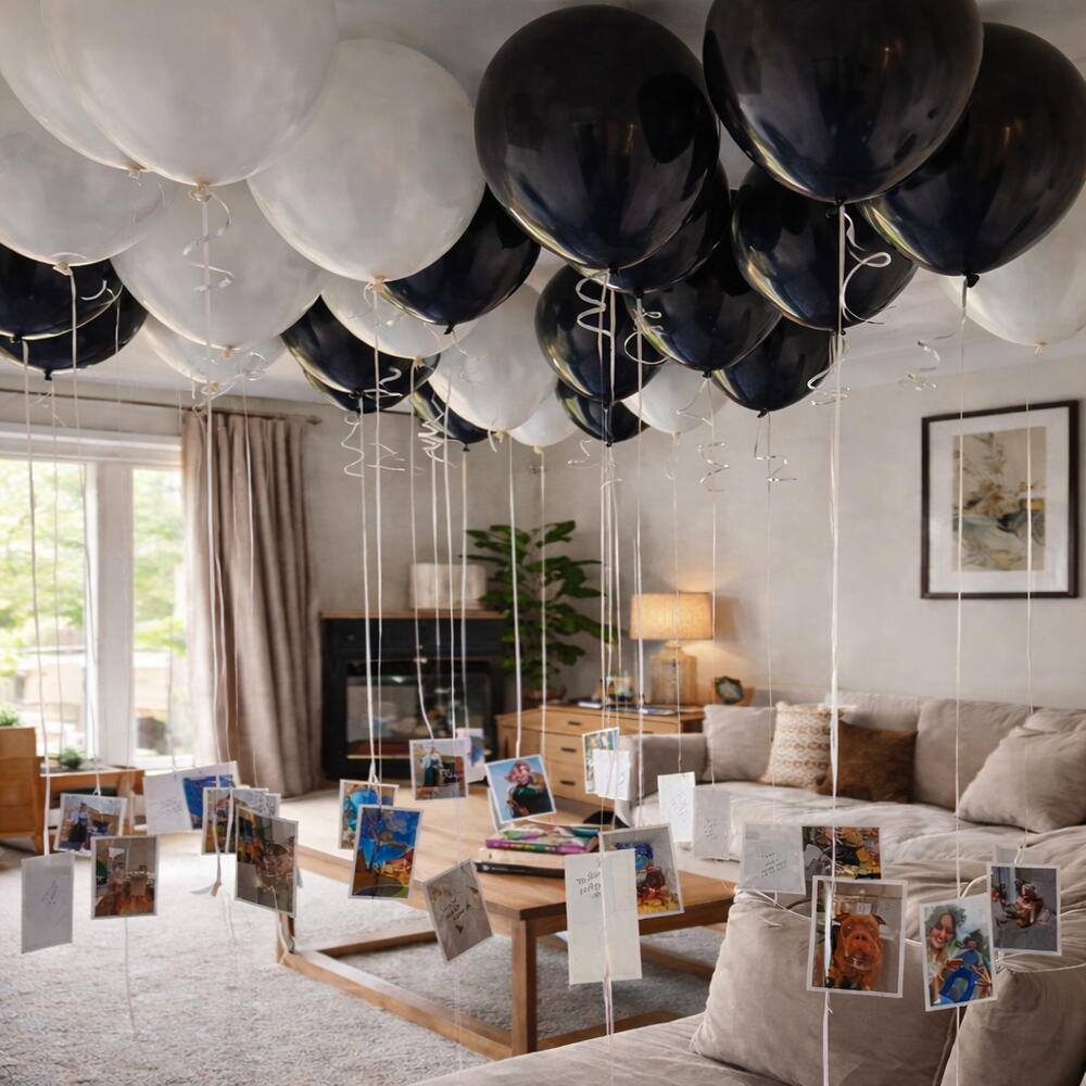 • 30 латексных шаров, заполненных гелием • Цвета: чёрный белый •20 персонализированных фотографий, прикреплённых к каждому шару • Для персонализации, пожалуйста, отправьте ваши изображения высокого разрешения или чёткие фотографии на электронную почту вместе с номером заказа после покупки.