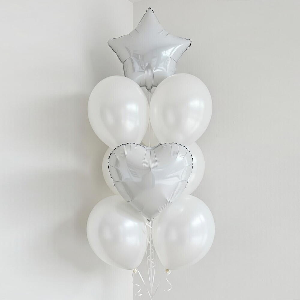 Количество 1 × Белый фольгированный шар в форме звезды 1 × Белый фольгированный шар в форме сердца 7 × Белые хромированные латексные шары Свежий и элегантный букет из белых шаров с эффектным металлическим звездным шаром в сочетании с соответствующим фольгированным шаром в форме сердца, окружённый глянцевыми хромированными латексными шарами для полного и сбалансированного вида. Эта композиция создаёт игривое, но утонченное впечатление, идеально подходит для дней рождения, празднований в честь рождения мальчика, встреч новорожденного, выпускных или вечеринок в современном стиле. Доставляется полностью надутым гелием, профессионально оформлен и завершён подходящими синими ленточками и надёжным грузиком для шаров. Время полёта на гелии Фольгированные шары: 2–3 дня (для использования в помещении) Латексные шары: 8–12 часов
