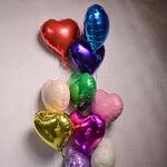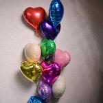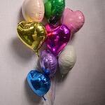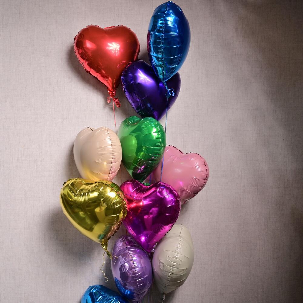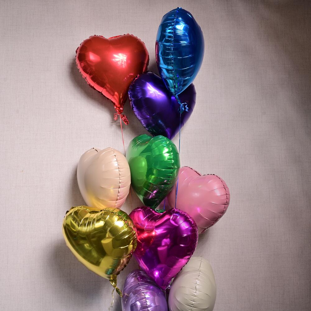 11 фольгированных шаров в форме сердца в ярком миксе оттенков красного, золотого, серебряного, розового, синего, зелёного, фиолетового и айвори. Наполнены гелием, с лентой и грузиком-основанием. Держатся в воздухе 8–10 часов.