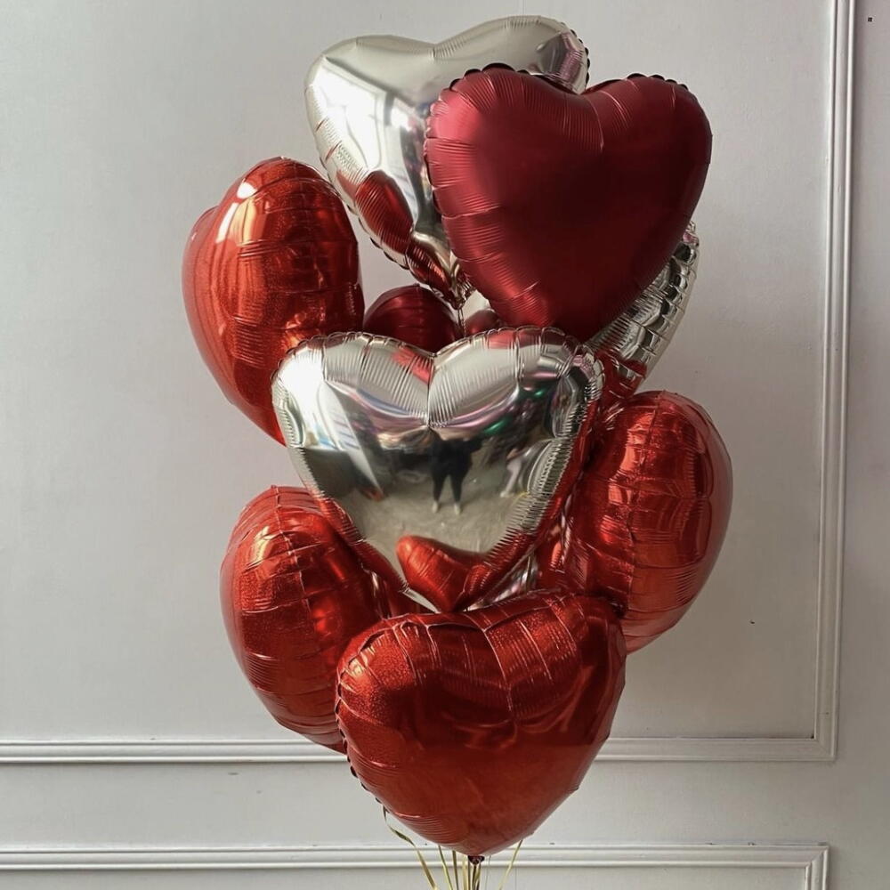 6 красных гелиевых фольгированных шаров в форме сердца 3 серебряных гелиевых фольгированных шара в форме сердца