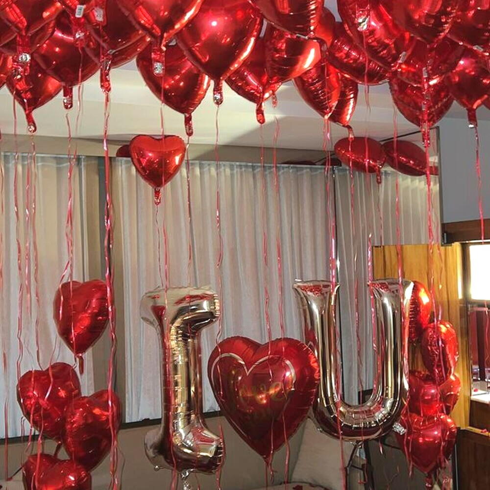 ● На потолке 30 красных фольгированных шаров в форме сердечек с гелием. 2 связки красных фольгированных шаров с гелием и 1 U, 30 красных латексных шаров на полу, лепестки 30 стеблей роз, разбросанные по полу с мебелью.
