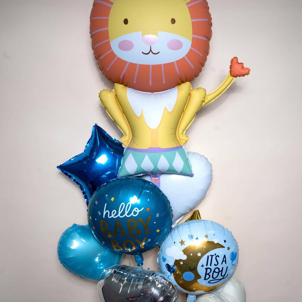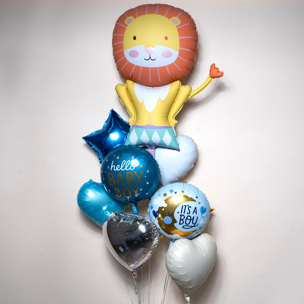 Набор фольгированных воздушных шаров «Королевский лев: мальчик — это мальчик» (8 шаров) Этот очаровательный набор фольгированных воздушных шаров «Королевский лев: мальчик — это мальчик» включает в себя 1 большой фольгированный шар в виде льва, 1 круглый шар «Привет, малыш!» и 1 круглый шар «Это мальчик!», а также 1 синюю звезду и 4 шара в форме сердца светло-голубого, белого, серебристого и бежевого цветов. Идеально подходит для вечеринок в честь рождения ребенка, приветствия новорожденного и празднования появления мальчика на свет, этот очаровательный набор добавит милый и праздничный штрих к любому декору. Подходит для украшения дома, оформления вечеринок и фотосессий, время полета в гелии составляет приблизительно 8–10 часов. 🎈🦁👶