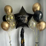 1 big black star with customized text 2 bunches by: 2 gold balloons 2 clear with confetti 1 black balloon