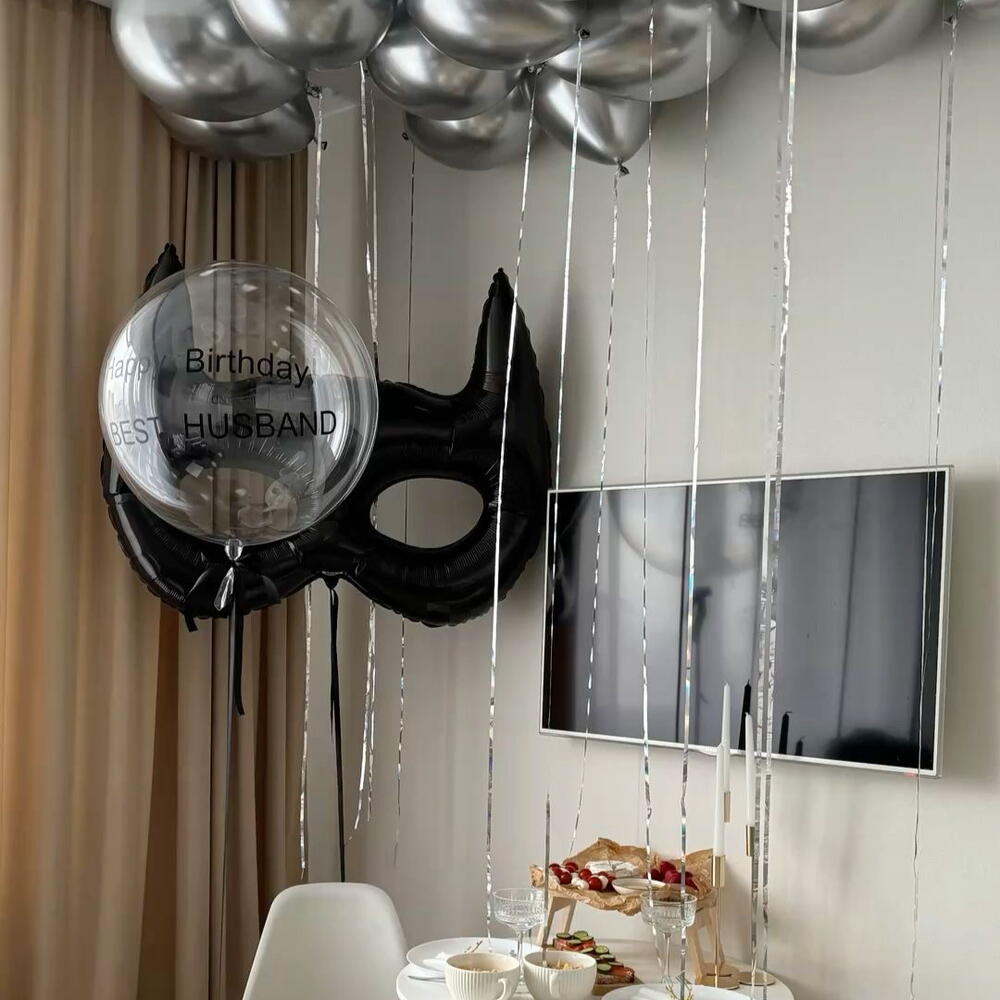 1 bubble balloon with customized text 1 mask figure 10 silver balloons on the ceiling