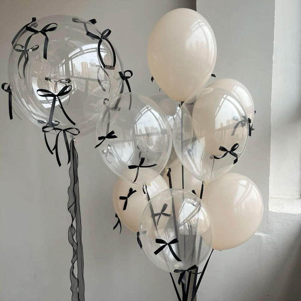 1 big bubble balloon with bows A bunch: 4 clear balloons with bows 6 cream balloons with bows