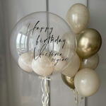1 Bubble balloon with customized text A bunch: 2 gold balloons 2 small mirror balloons with confetti 3 plain cream balloons