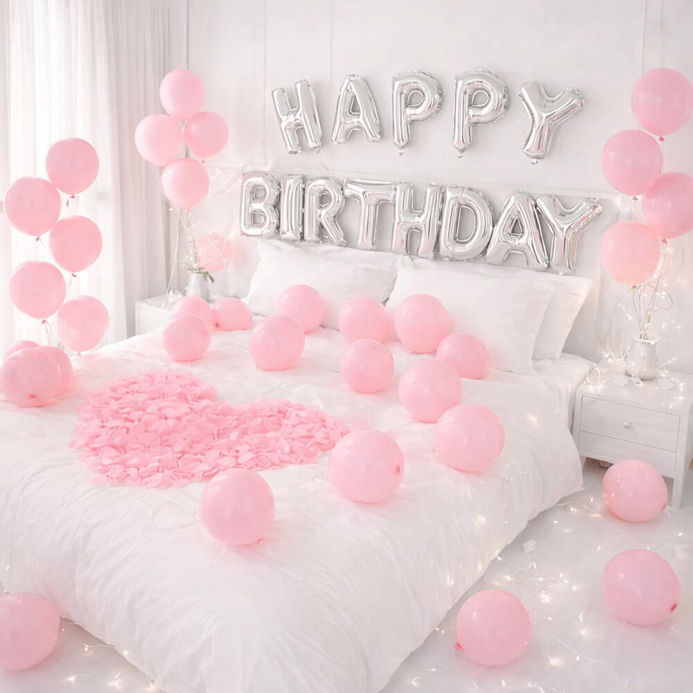 Отпразднуйте самым романтичным и незабываемым образом с этим красиво оформленным набором для украшения комнаты к дню рождения. В комплект входит потрясающий фольгированный баннер-гирлянда с буквами «Happy Birthday», элегантно размещённый над кроватью, 50 нежно-розовых латексных шаров, расставленных по комнате для создания мечтательной атмосферы, и композиция в форме сердца из нежных розовых лепестков, идеально уложенная на кровати. Эта продуманная декорация превращает любую спальню или номер в гостинице в волшебное пространство для праздника, наполненное теплом, любовью и очарованием. Идеально подходит, чтобы удивить партнёра или близкого человека — этот набор создаёт идеальную атмосферу для незабываемых моментов и фотогеничных торжеств.