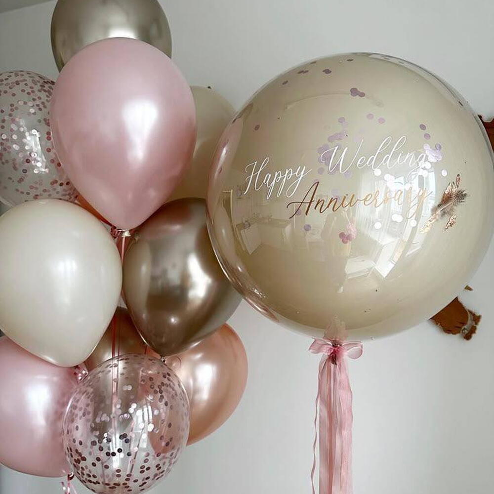Wedding day is a wonderful event where you can come with balloons, and they will become a real surprise for the newlyweds! 1 latex white sand balloon 24 inside bubble 36 with round pink confetti inside, with white inscription, with light pink satin ribbon and bow, with weight Bunch with weight: (with pink ribbons) 3 latex chrome champagne balloons 12 2 latex clear balloons 12 with round pink confetti 3 latex metallic rose gold balloons 12 2 latex pearl pink balloons 12 2 latex white sand balloons 12 You can change the inscription to your own. Product color may slightly vary due to photographic lighting sources or your monitor settings. All latex balloons are treated with hi-float for long flight. Also, the customer can be offered a replacement for a similar product.