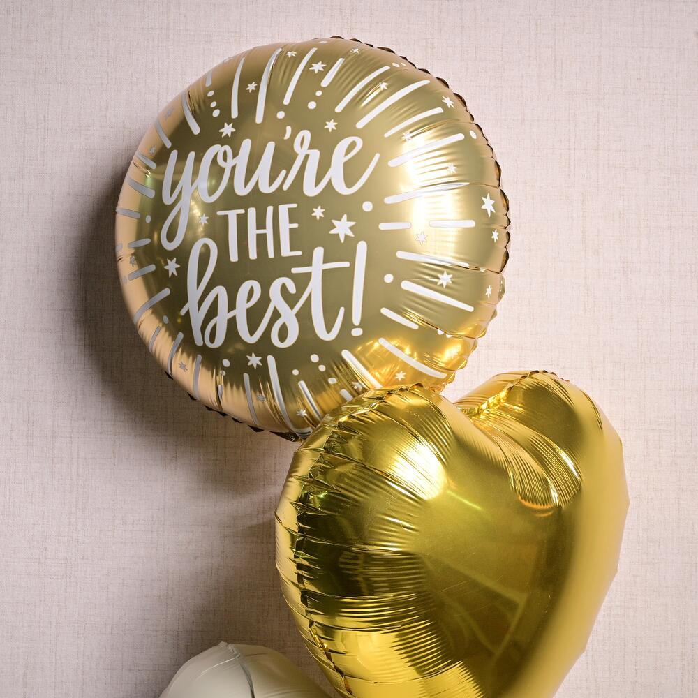 Набор фольгированных шаров «Ты лучший» из 5 гелиевых шариков: 1 круглый и 4 в форме сердца, золотого и серебряного цветов. Шары будут наполнены гелием с утяжелителем внизу. Гелия хватит на 8-10 часов.