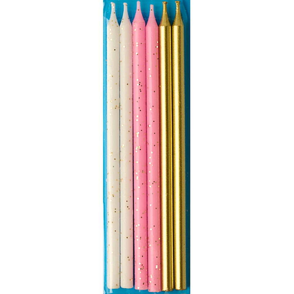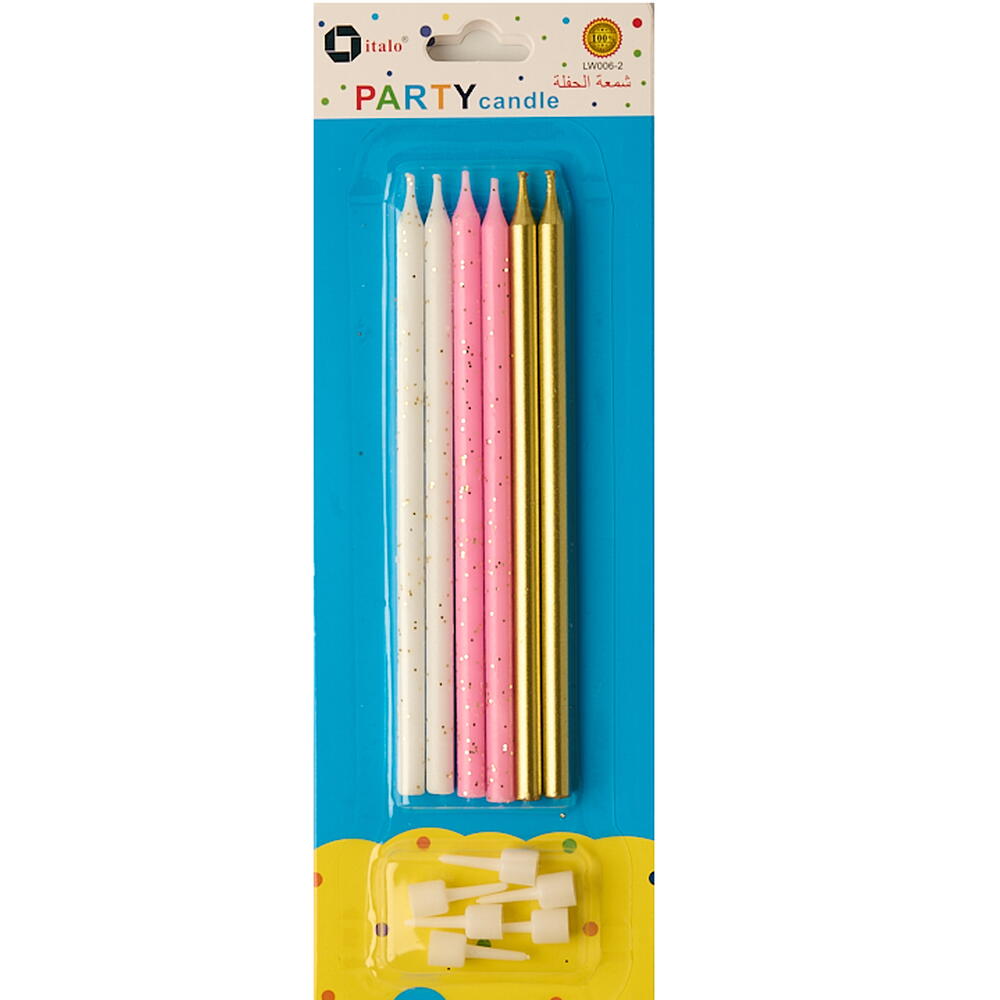 6 праздничных свечей, высоких и тонких. Подходят для дней рождения и годовщин. Каждая свеча высотой 12,5 см.