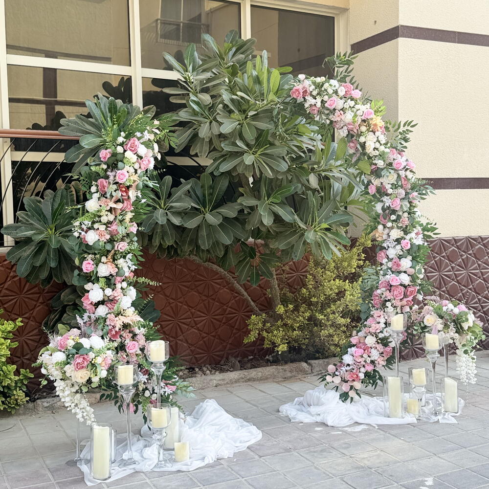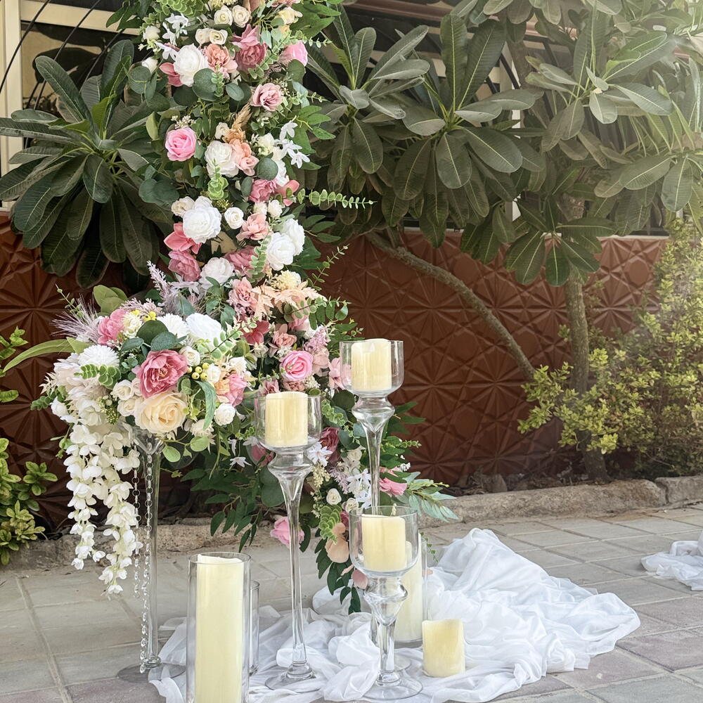 candles - 12 шт. artificial flowers - 310 шт. fabric - 2 шт. candlesticks - 6 шт. composition - 2 шт. arch rays - 1 шт.