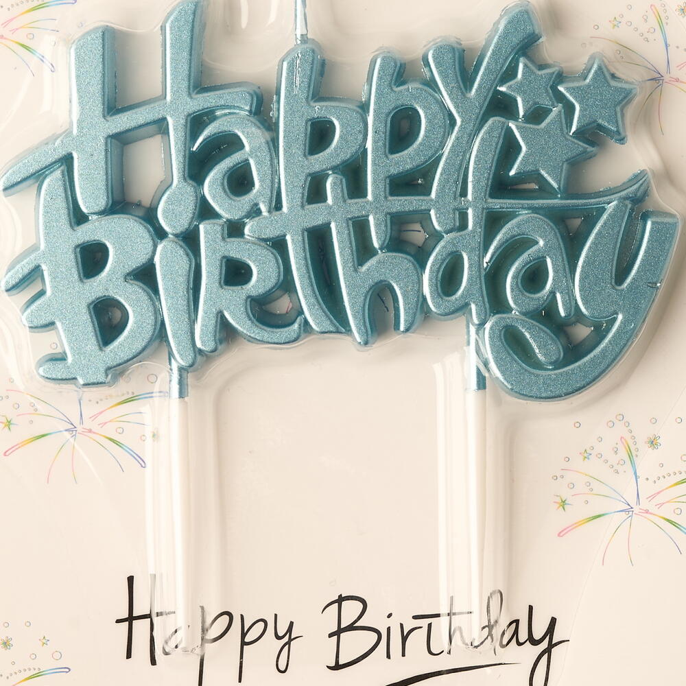 Топпер для торта «Happy Birthday» (полная надпись), элегантная свеча, металлического синего цвета.