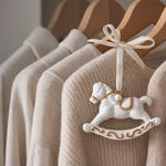 A beautifully crafted horse-shaped scented sachet designed to gently perfume your wardrobe, drawers or home spaces. Made from high-quality plaster and infused with a long-lasting fragrance, it adds both elegance and aroma wherever it hangs. Perfect for closets, gift boxes, baby rooms, or as a charming decorative accent. Hand-finished with gold details and a satin ribbon for a luxurious touch. Scented with Spa notes perfume Notes: Floral Head Orange Blossom / watermelon Heart coconut / star jasmine Background amber wood / vanilla