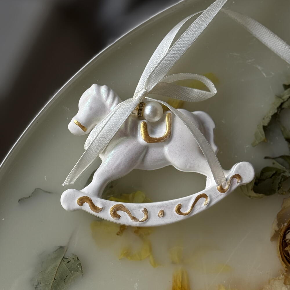 A beautifully crafted horse-shaped scented sachet designed to gently perfume your wardrobe, drawers or home spaces. Made from high-quality plaster and infused with a long-lasting fragrance, it adds both elegance and aroma wherever it hangs. Perfect for closets, gift boxes, baby rooms, or as a charming decorative accent. Hand-finished with gold details and a satin ribbon for a luxurious touch. Scented with Spa notes perfume Notes: Floral Head Orange Blossom / watermelon Heart coconut / star jasmine Background amber wood / vanilla