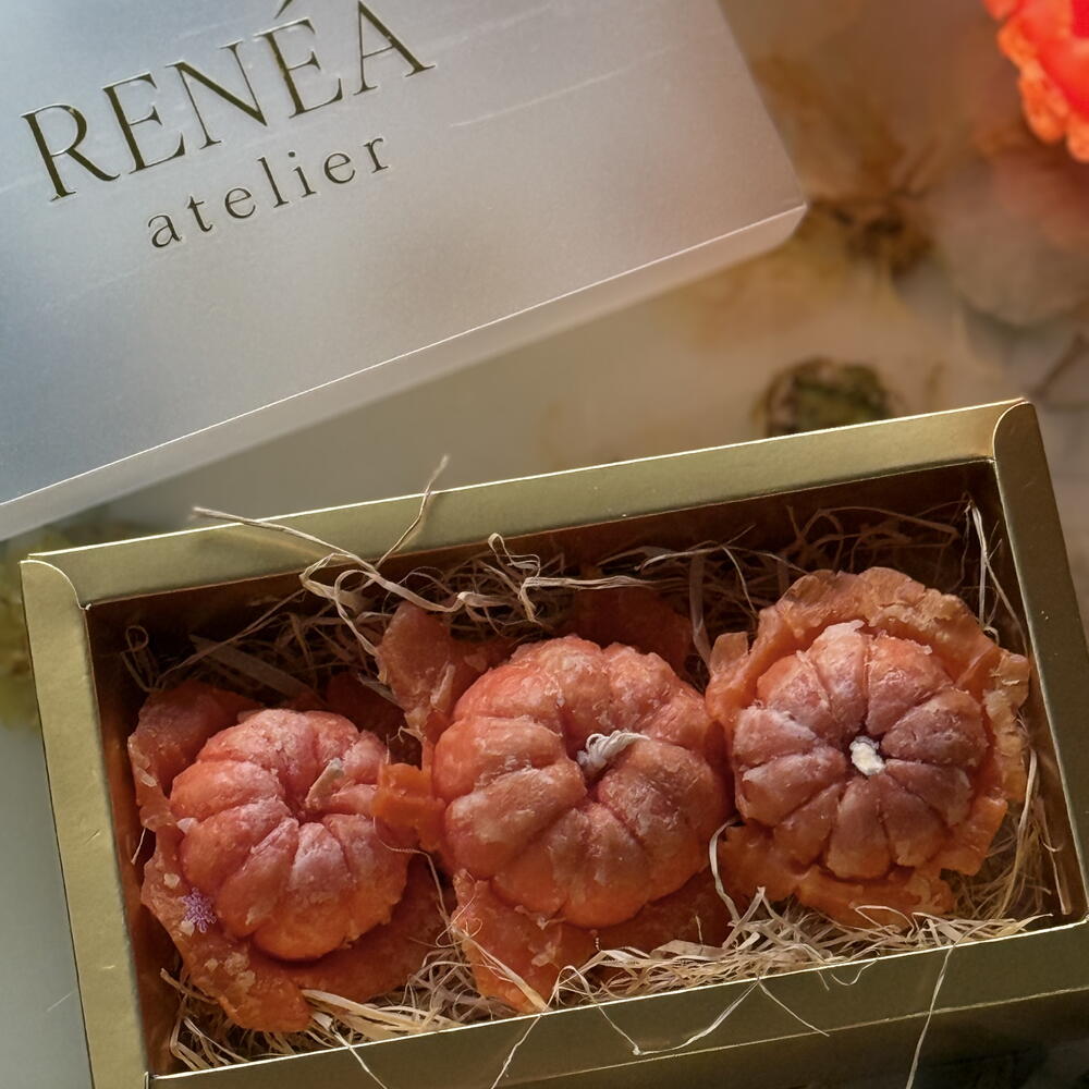 A charming gift set of handcrafted tangerine candles made from premium olive wax and infused with a fresh, juicy citrus scent. Each piece is shaped and textured to look like a real peeled tangerine — vibrant, unique, and incredibly festive. Perfect for holiday gifting, kitchen décor, table styling, or adding a playful seasonal touch to your home. Comes beautifully packaged in a RENÉA atelier gift box.