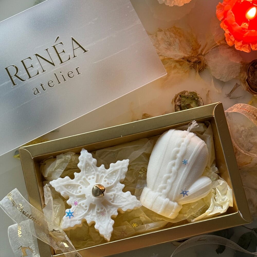 A charming Christmas candle gift set featuring a detailed snowflake candle and a cozy knit-texture mitten candle, both handcrafted from premium olive wax. Each piece is delicately decorated with subtle winter accents, creating a soft and elegant festive look. Perfect for holiday gifting, home décor, and adding a warm seasonal touch to any space. Beautifully packed in a luxury RENÉA atelier gift box.