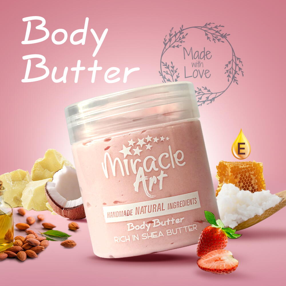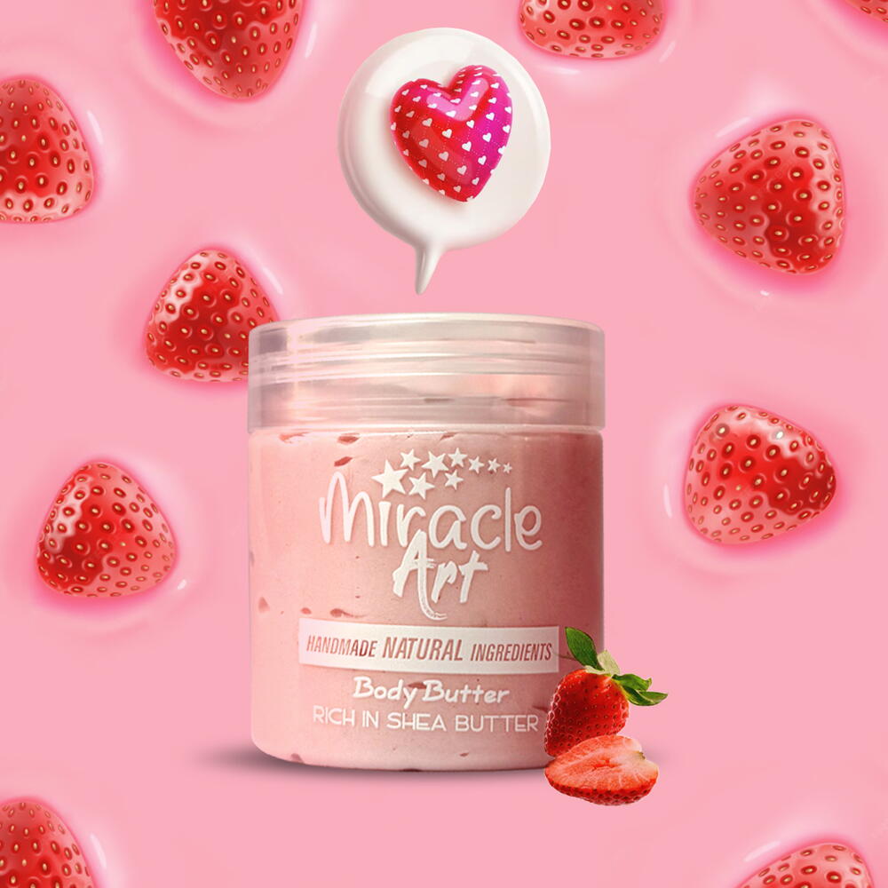 Побалуйте свою кожу восхитительным удовольствием с нашим веганским баттером для тела Berry Bliss! Изготовленный вручную с заботой, этот роскошный баттер для тела пропитан сочным ароматом клубники, который приносит взрыв радости в вашу уходовую рутину. Ключевые особенности: Непреодолимый аромат клубники: Окунитесь в сладкий, фруктовый запах, который поднимает настроение и превращает каждое нанесение в приятное лакомство. Глубоко питающая формула: Обогащена маслом ши, маслом кокум, кокосовым и миндальным маслами, этот баттер глубоко проникает и обеспечивает интенсивное увлажнение, оставляя кожу мягкой и бархатистой. 100% веганский состав: Наш баттер разработан на основе 100% веганских ингредиентов, что позволяет питать кожу без вредных химикатов. Попрощайтесь с коммерческими продуктами, полными синтетических добавок! Насыщен витамином E: Богатый витамином E, наш состав не только увлажняет, но и помогает восстанавливать и омолаживать кожу, способствуя здоровому, сияющему виду. Подходит для всех типов кожи: Идеально разработан, чтобы подходить для любого типа кожи, этот баттер обеспечивает питательные преимущества для каждого. Ручная работа: Каждая баночка с любовью изготовлена вручную, что отражает нашу приверженность качеству и использованию натуральных ингредиентов. Как использовать: Нанесите щедрое количество на сухую кожу, уделяя внимание областям, требующим особого ухода. Массажируйте мягкими движениями до полного впитывания и позвольте приятному аромату клубники сопровождать вас весь день! Объем 120 мл, наш веганский баттер для тела Berry Bliss — обязательное дополнение к вашей уходовой рутине. Помните, кожа впитывает то, что вы наносите, поэтому важно выбирать продукты, свободные от вредных химикатов. Выбирайте Miracle Art для чистого, натурального ухода за кожей, который так же приятен, как и пахнет! Побалуйте себя сладостью кожи с ароматом клубники и поднимите уровень своего ухода за собой уже сегодня!