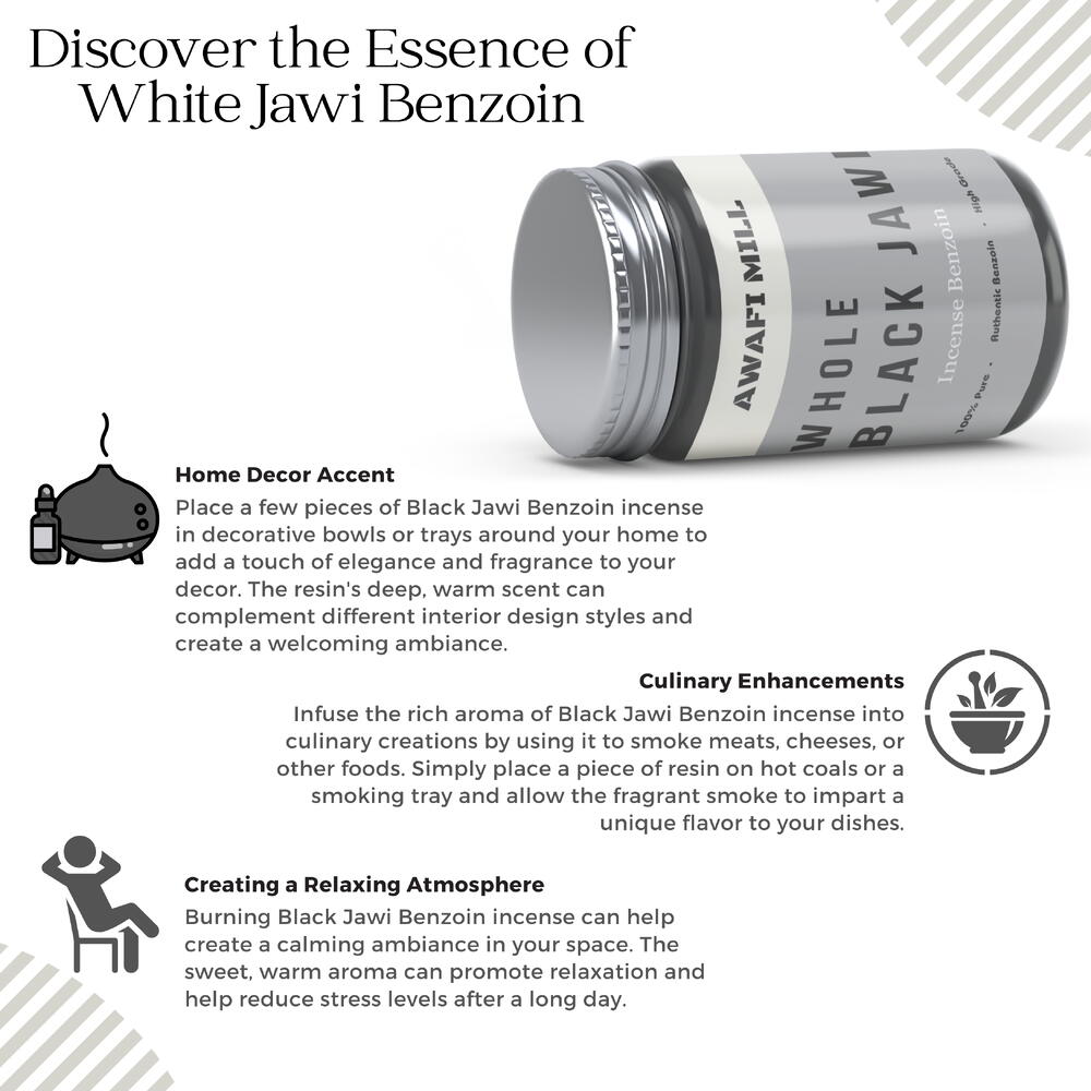 Черный ладан с бензоином яви, известный своей изысканной и роскошной эссенцией. Преобразите свое окружение с помощью теплого и успокаивающего аромата, который обожают любители ванили. Улучшите свои чувственные ощущения благодаря искусному изготовлению благовоний с черным джави-бензоином awafi mill. Идеально подходит для того, чтобы расслабиться после долгого дня или усилить медитативные практики и осознанность. Насладитесь длительным ароматическим путешествием, поскольку наши ароматические палочки издают стойкий аромат ванили.