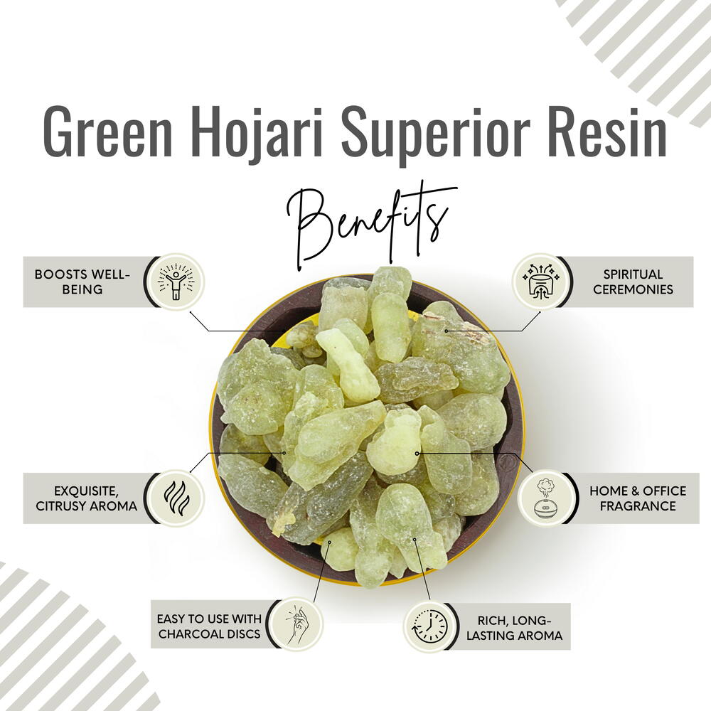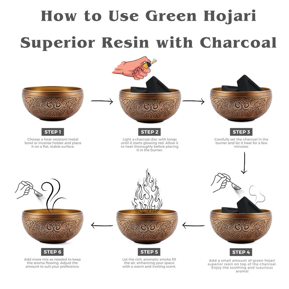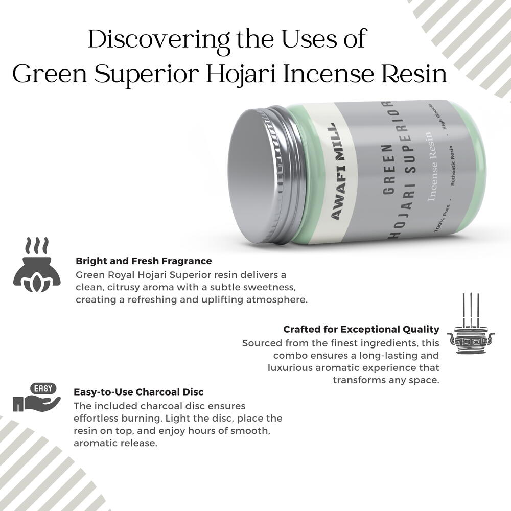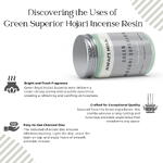 Зеленый королевский ходжари улучшенный с крупными слезинками, собранными с деревьев босвеллии сакра Идеально подходит для усиления медитации, расслабления или создания священной атмосферы Смола босвеллии сакра, создающая аутентичный и поднимающий настроение аромат Треугольная таблетка древесного угля для легкого и эффективного сжигания, обеспечивающая устойчивое выделение аромата.