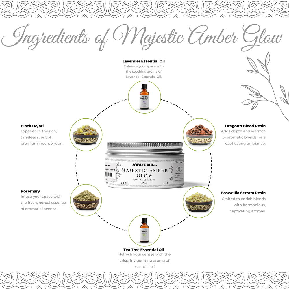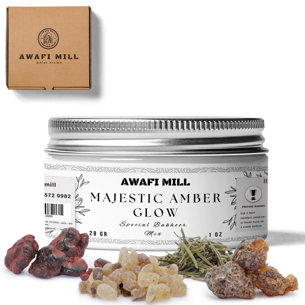 AWAFI MILL представляет Majestic Amber Glow Bakhoor Mix, премиальную смесь благовоний, которая объединяет лучшие натуральные ингредиенты для успокаивающего и духовного опыта. Состав включает смолу Boswellia Serrata, чёрный Hojari, смолу Драконьей крови, розмарин и чистые эфирные масла лаванды и чайного дерева для умиротворяющего аромата. Вдохновение со всего мира: Пакистан: вдохновлённые богатым духовным наследием Пакистана, смола Boswellia Serrata и чёрный Hojari являются неотъемлемой частью древних ароматических ритуалов. Ближний Восток: смола Драконьей крови придаёт мистические, заземляющие качества. Европа: свежие, успокаивающие ноты эфирных масел лаванды и чайного дерева создают расслабляющую и терапевтическую атмосферу. Преимущества и применение: Очищает воздух: помогает очищать воздух и наполнять пространство успокаивающим ароматом. Создаёт умиротворённую атмосферу: идеальна для медитации, духовных практик или релаксации, эта смесь способствует покою и спокойствию. Идеально для дома и офиса: прекрасно подходит для улучшения любого пространства своим мирным, заземляющим ароматом. Как использовать: Подготовьте жаропрочную курильную посуду или уголь. Зажгите уголь, пока он не раскалится. Поместите небольшое количество Majestic Amber Glow Bakhoor Mix на раскалённый уголь или в электрическую курильницу. Наслаждайтесь успокаивающим и очищающим ароматом, наполняющим ваше пространство. Ощутите богатый и успокаивающий аромат AWAFI MILL Majestic Amber Glow Bakhoor Mix, идеальное сочетание натуральных смол и эфирных масел, созданное для того, чтобы наполнить ваше окружение миром и спокойствием.