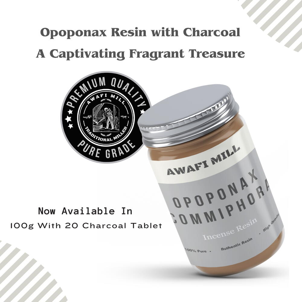 AWAFI MILL Благовоние из смолы опопонакса | Угольные таблетки - бутылка 100 г с 20 кусочками угля