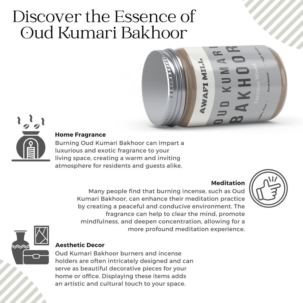 Разбудите свои чувства богатым и пленительным ароматом уд кумари Выпуская завораживающий аромат, который превратит ваше пространство в рай роскоши Насладитесь очарованием этого драгоценного аромата, который привнесет нотку эксклюзивности в вашу коллекцию Создание атмосферы роскоши и изысканности Oud kumari bakhoor создан с точностью, гарантирующей, что каждый чип воплощает в себе сущность качества и аутентичности