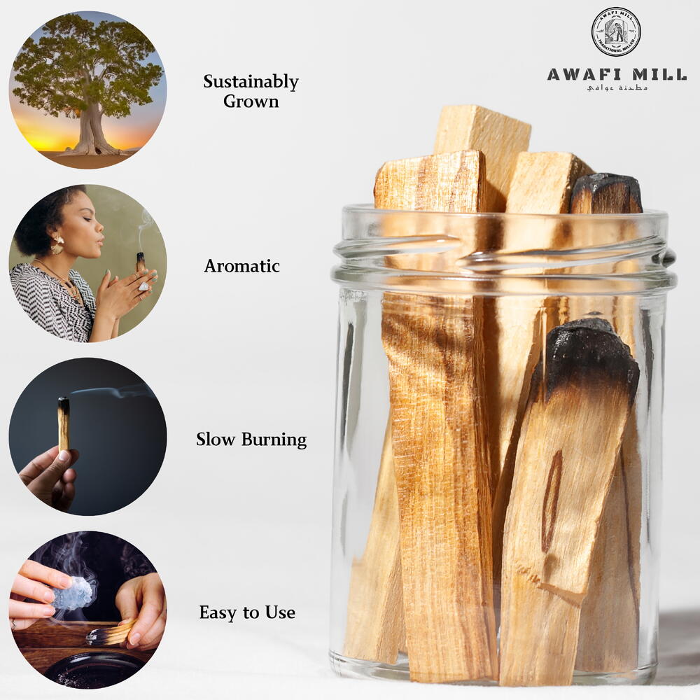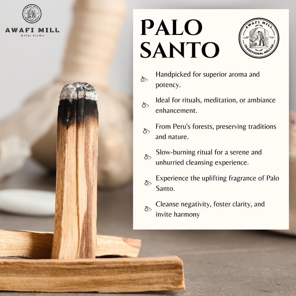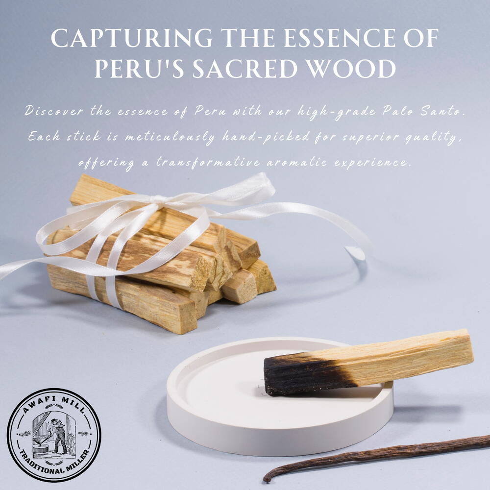 Awafi Mill предлагает вам лучшие палочки для окуривания Пало Санто из мистических земель Перу. Полученные устойчивым способом и собранные вручную, наши палочки Пало Санто являются свидетельством нашей приверженности качеству и этичным практикам. Погрузитесь в чистый и сладкий аромат Пало Санто, известного своими успокаивающими и заземляющими свойствами. Каждая палочка тщательно отбирается, чтобы обеспечить премиальный опыт окуривания, делая их идеальными для духовных ритуалов, медитации или просто для создания умиротворяющей атмосферы в вашем пространстве. Поднимите свою духовную практику с палочками для окуривания Пало Санто от Awafi Mill — где традиция встречается с качеством для по-настоящему обогащающего опыта.