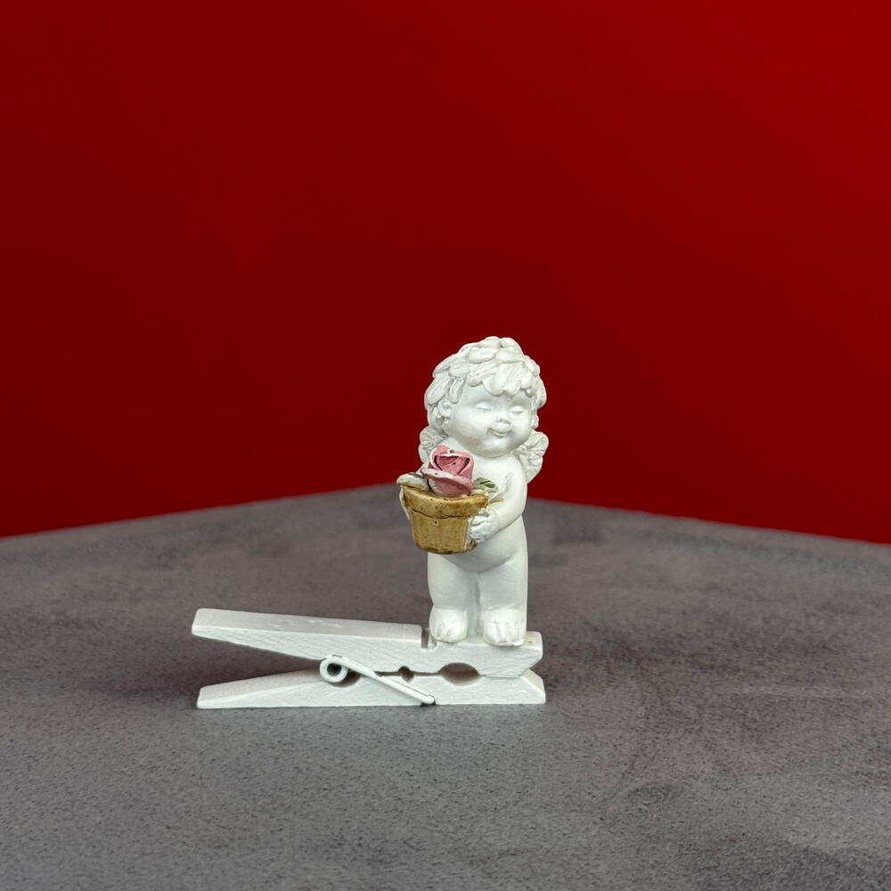 Это изысканное изделие представляет собой прекрасно выполненного керамического ангелочка, держащего горшок с розой на прочной подставке из белых деревянных штырей.