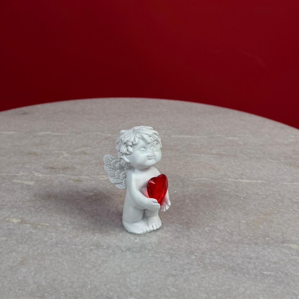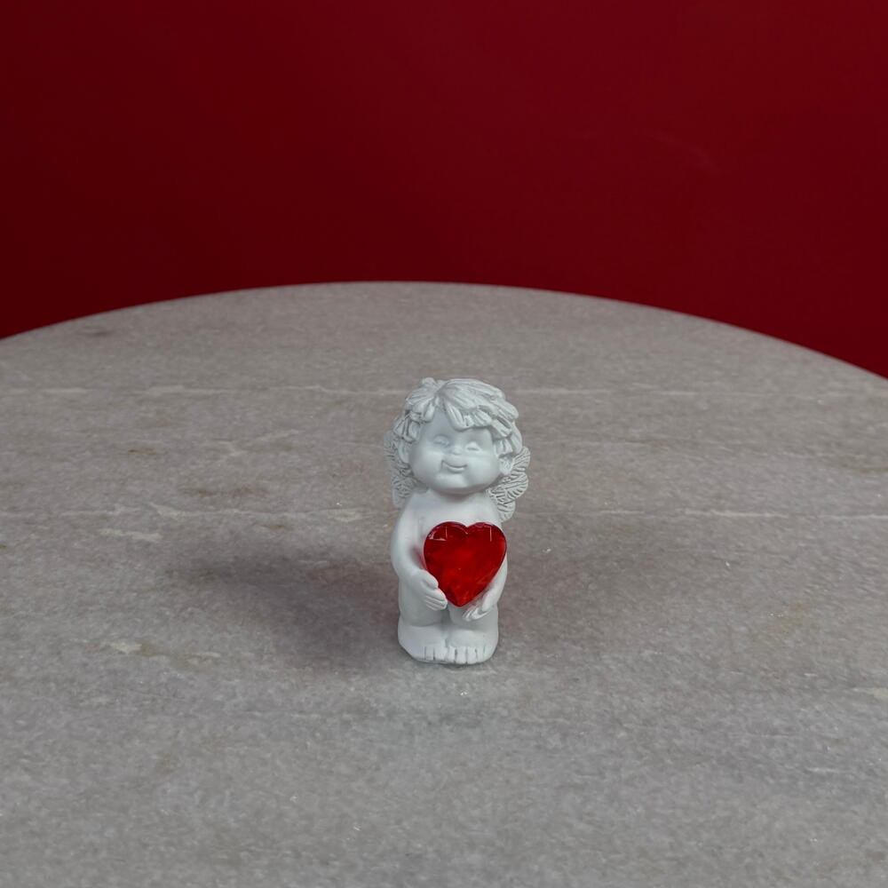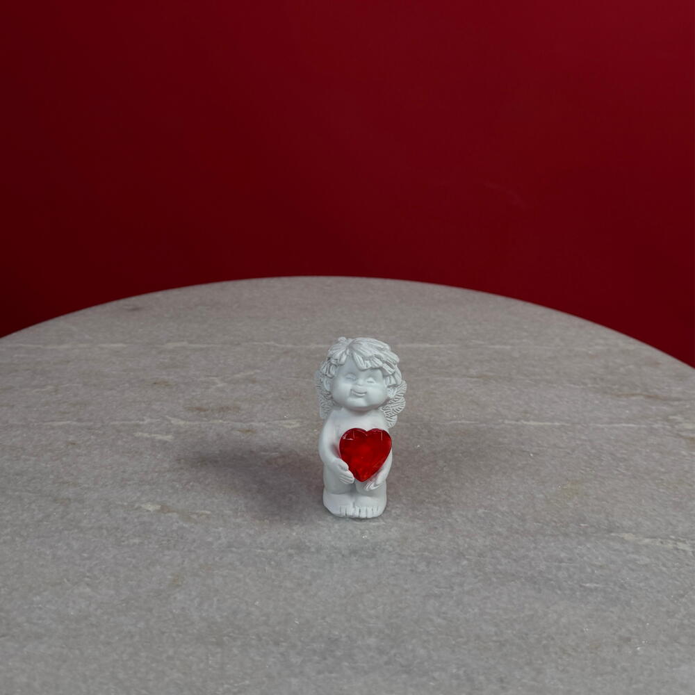 Это изящное изделие тщательно выполнено из гладкой керамики и изображает спокойного ангела с элегантно сформированными крыльями и струящимся платьем. Ангел нежно держит небольшое ярко-красное сердечко — радостный символ рождественского тепла, преданности и сострадания.