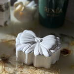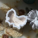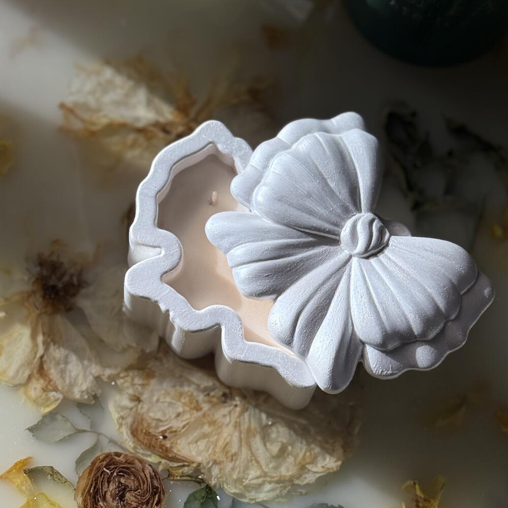 Elegant and delicate, this hand-poured aromatic candle in a pearly bow shape brings warmth and charm to any space. Crafted with premium wax and carefully selected fragrance oil, it fills the room with a soft, cozy scent while serving as a beautiful décor piece. Perfect as a thoughtful gift or a stylish accent for your home, this candle adds a touch of romance and comfort to everyday moments. After the candle burns out, the vessel can be reused as a keepsake box for jewelry, small treasures, or décor, making the gift long-lasting and meaningful. Nett weight 80 gr ~15h burning time