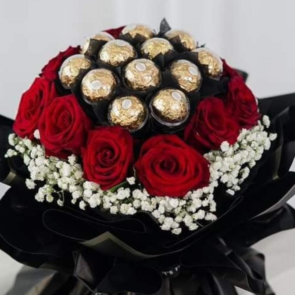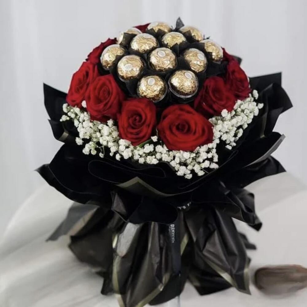 Этот завораживающий Sweet Bouquet — воплощение изящного наслаждения. Состоящий из 15 роскошных конфет Rocher, искусно переплетённых с 15 красными, сочными розами и с деликатной ноткой из 5 белых веточек гипсофилы, он демонстрирует класс, красоту и сладость в равной мере. Это сочетание неотразимо объединяет вечное очарование цветущих роз и соблазнительный вкус шоколада, увенчанный невинностью гипсофилы. Идеальный знак любви, признательности или празднования, это больше, чем букет; это искреннее чувство.