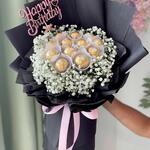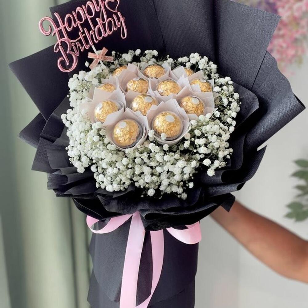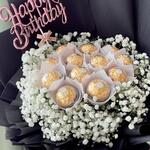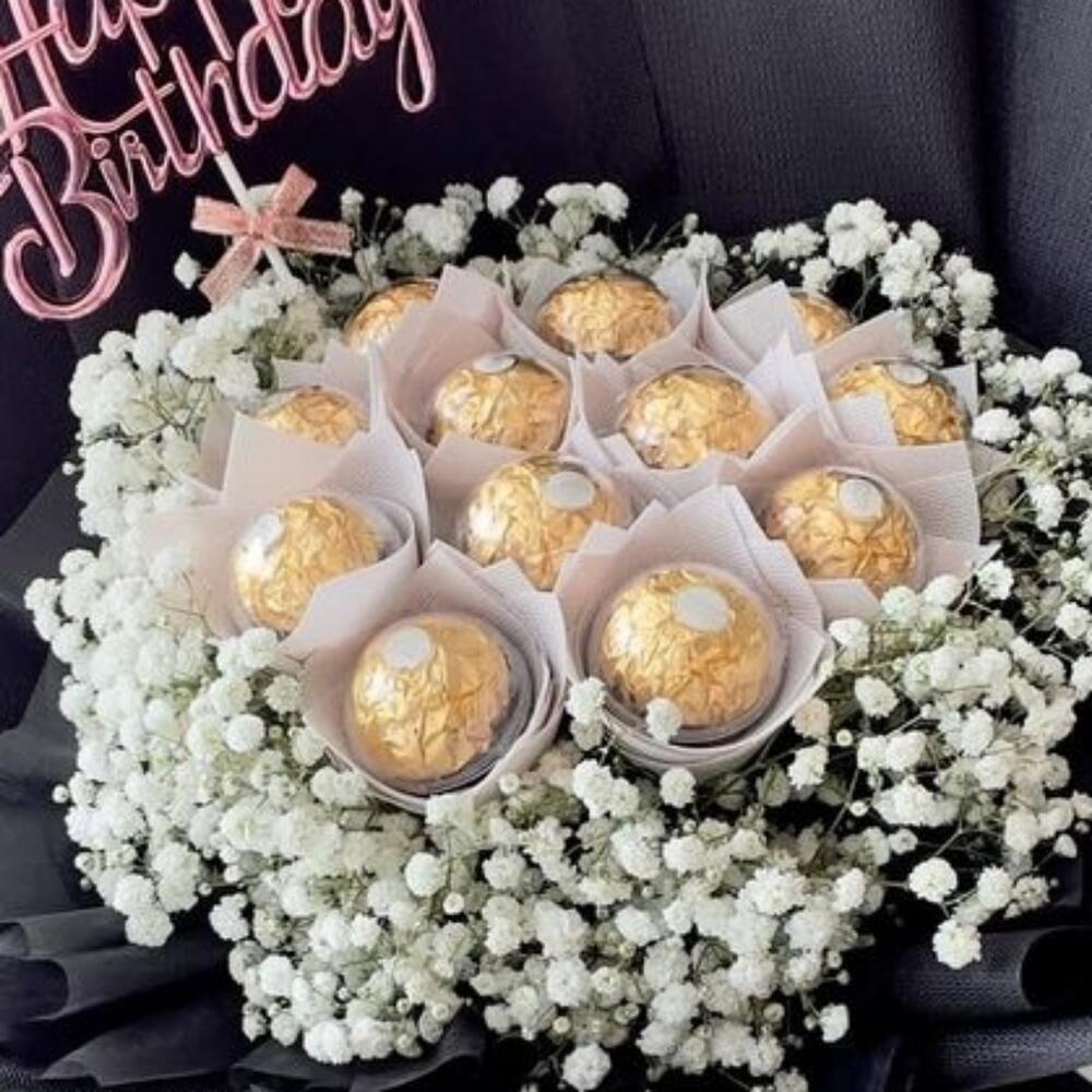 gypsophila white - 5 шт. ferrero rocher chocolates - 11 шт. топпер на день рождения - 1 шт.