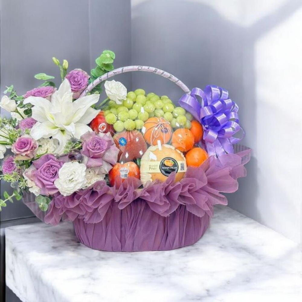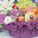 Корзина обернута фиолетовой тканью с рюшами и украшена фиолетовым бантом справа. Цветы: Большая белая лилия выделяется в центре цветочной композиции. В композицию также входят фиолетовые розы, белые цветы и зелёная листва. Фрукты: В корзине лежит гроздь зелёного винограда. Там несколько маленьких круглых оранжевых плодов, вероятно, мандарины или клементины. Видна груша, завернутая в защитную сетку.