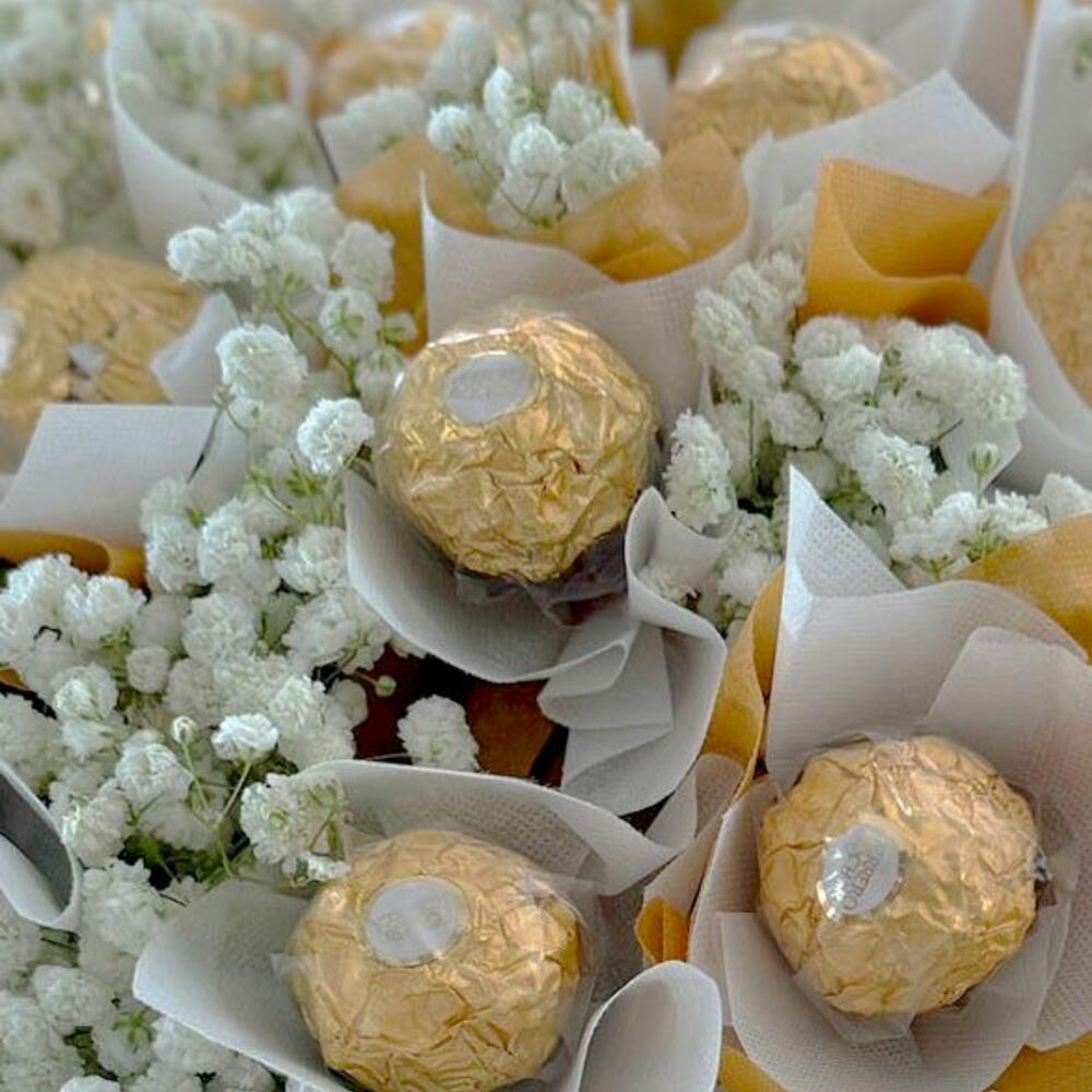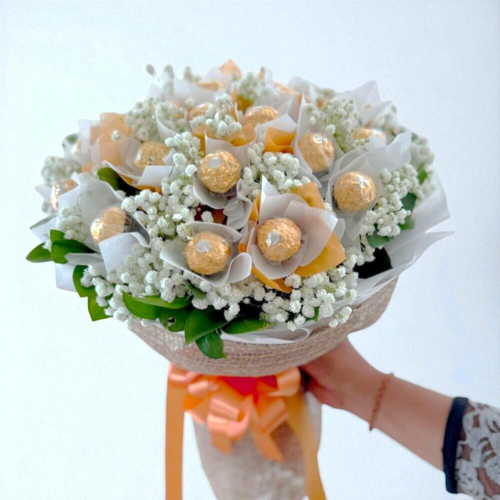 Gypsophila - 20 шт. ferrero rocher chocolates - 30 шт. зелёный лист - 10 шт.