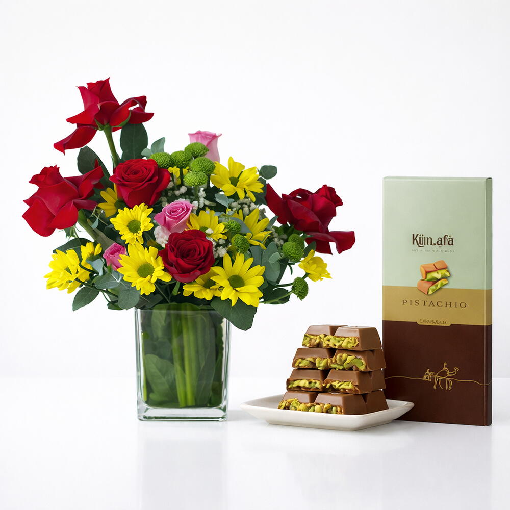 Red rose - 5 шт. Eucalyptus - 5 шт. Pink rose - 3 шт. Vase - 1 шт. желтая хризантема - 3 шт. шоколадный батончик с фисташковой кунафой malakiya (160 г) - 1 шт.