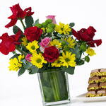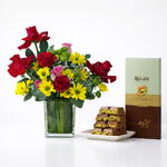 Радостное сочетание свежих смешанных цветов и премиального шоколада, созданное, чтобы восхищать с первого взгляда. Идеально для дней рождения, моментов благодарности, поздравлений или сладких сюрпризов, которые кажутся продуманными и изысканными. Свежесобрано. Красиво упаковано. Доставлено с заботой.