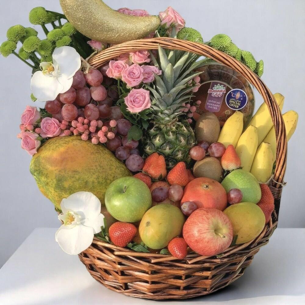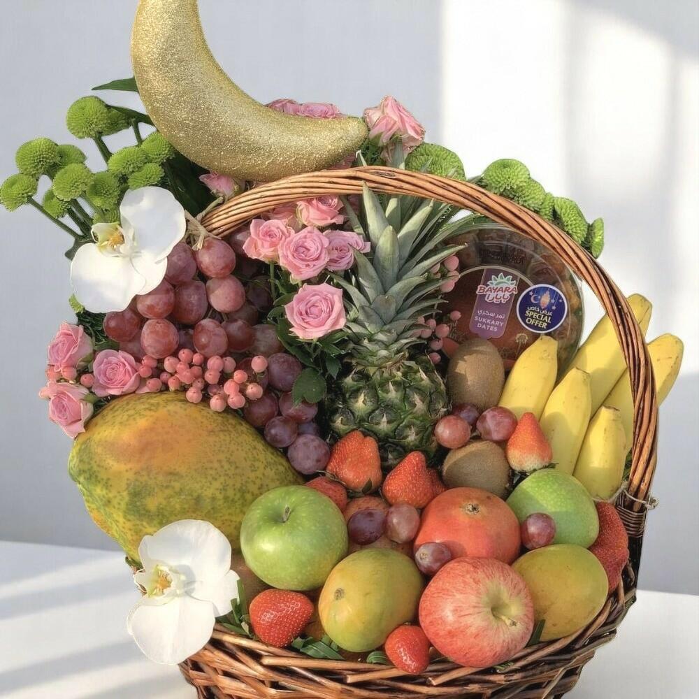 Это красиво оформленная роскошная корзина с фруктами и цветами, идеально подходящая для праздничных подарков или особых случаев. Корзина наполнена восхитительным ассортиментом свежих, высококачественных фруктов, включая яблоки, бананы, папайю, виноград, киви, ананас, клубнику и манго. Украшенная элегантными розовыми розами, нежными белыми орхидеями и яркой зеленью, композиция увенчана мерцающим полумесяцем — идеально для празднований, таких как Рамадан или Ид. Чтобы сохранить свежесть, держите корзину в прохладном, затенённом месте вдали от прямых солнечных лучей. Аккуратно промойте фрукты перед употреблением. Для оптимального качества сразу удаляйте перезревшие плоды. Цветы можно ежедневно слегка опрыскивать чистой водой, чтобы они дольше оставались свежими и яркими.