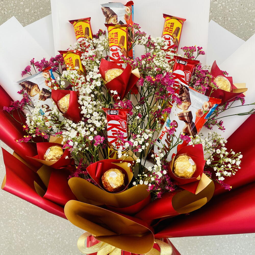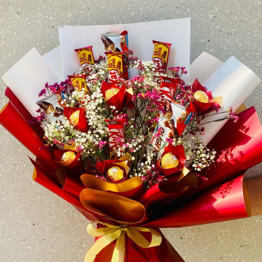 Побалуйте себя чистым наслаждением с букетом шоколадного блаженства — роскошной композицией из премиального шоколада, искусно упакованной и украшенной элегантными начинками и атласной лентой. Идеально подходит для подарка или побалуйте себя чем-то по-настоящему особенным. Ингредиенты: Ferrero Rocher — 6 шт. Kinder Bueno — 3 шт. KitKat (20,5 г) — 6 шт. Сезонные начинки — 3 шт. Упаковочная бумага — 5 шт. Атласная лента — 1 шт. Красиво упакованный букет, сочетающий в себе сладость, элегантность и частичку любви, идеально подходит для дня рождения, подарка в знак благодарности или любого другого праздника. 🍫🎀