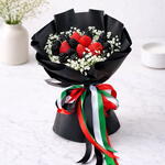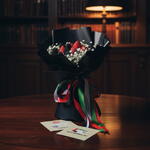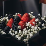 Strawberry, blackberries and baby breath wrapped in a black paper and tie to white , red, black, green ribbon.