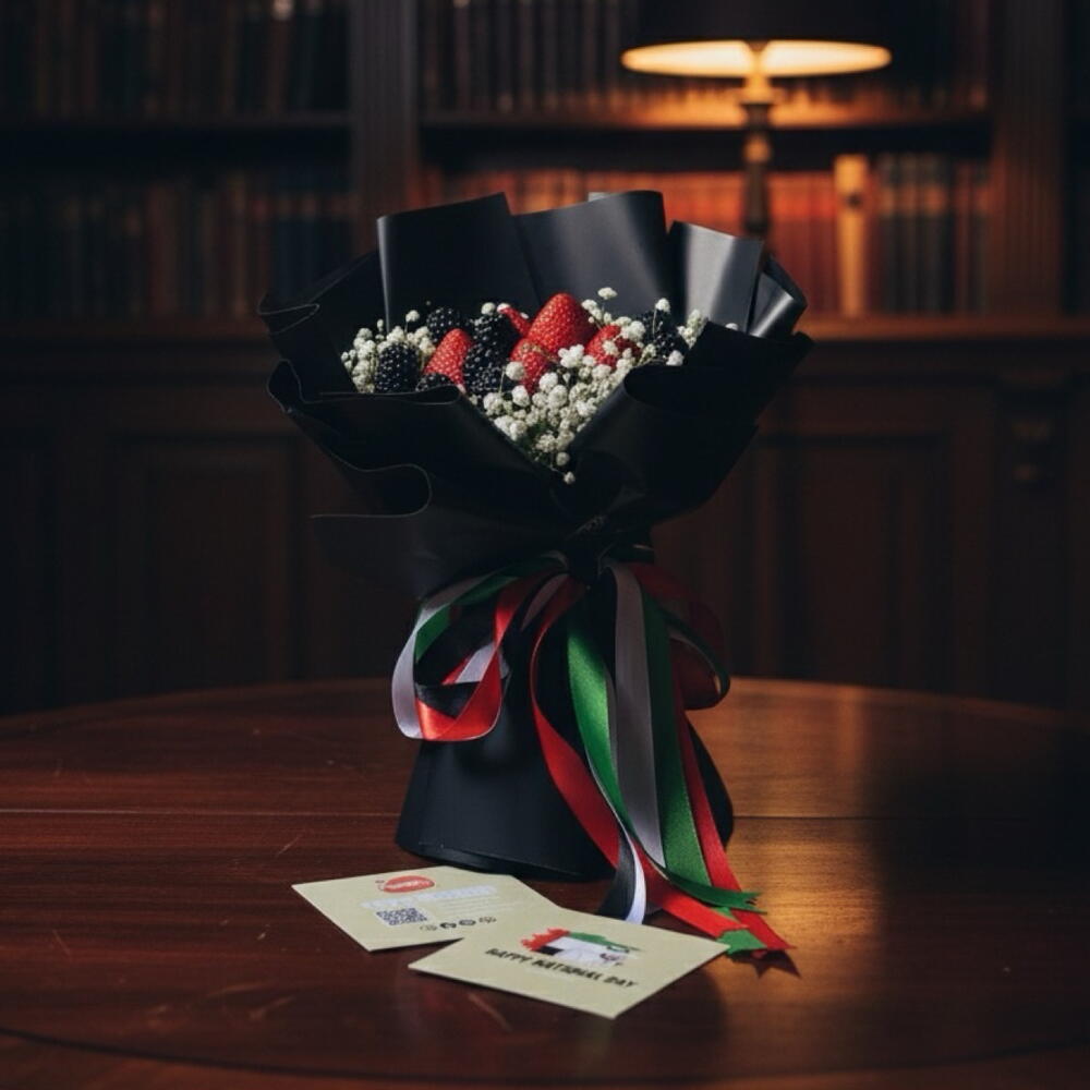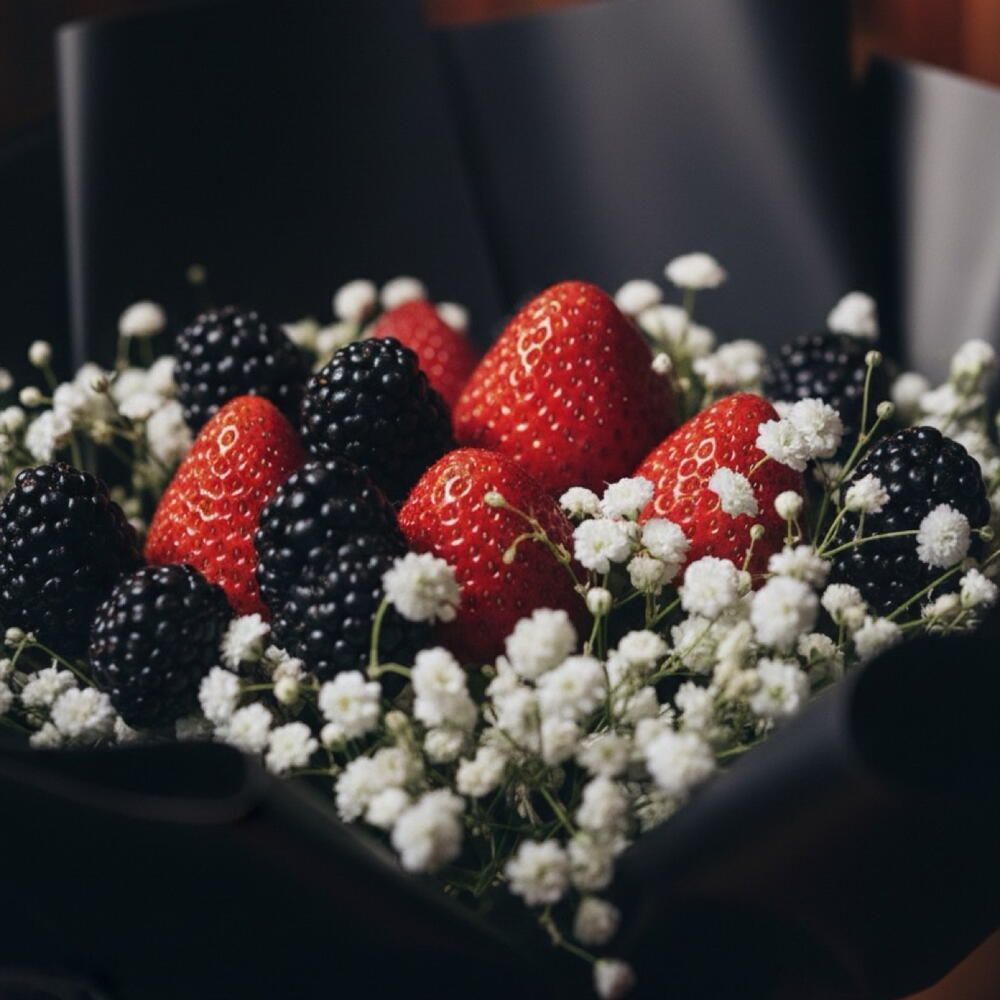 Strawberry, blackberries and baby breath wrapped in a black paper and tie to white , red, black, green ribbon.