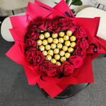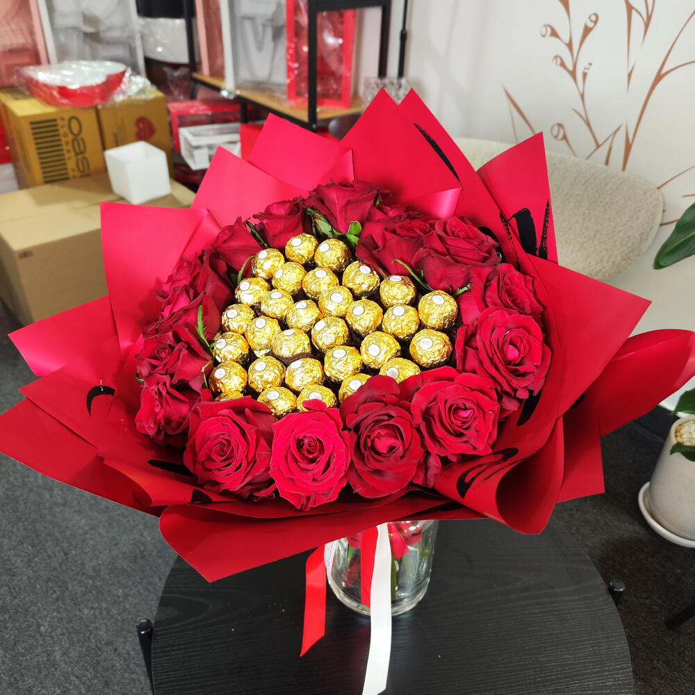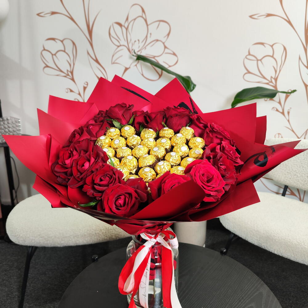 Этот букет символизирует любовь, страсть и сладость, делая его идеальным для таких случаев, как День святого Валентина, годовщины, предложения руки и сердца или романтические торжества. Он сочетает красоту и наслаждение в одной потрясающей композиции.