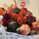 Chrysanthemum - 5 шт. avocado - 2 шт. зелень эвкалипта - 6 шт. strawberries - 250 гр. pomegranate - 5 шт. красное яблоко - 8 шт. cherries - 150 гр. peaches - 5 шт. вимто - 1 шт.