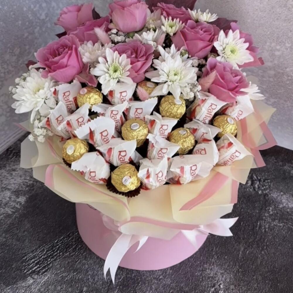 white chrysanthemum - 2 шт. ferrero rocher chocolates - 8 шт. pink round box - 1 шт. шоколад raffaello - 15 шт. тепло-розовая роза - 10 шт.