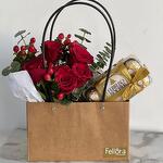 Red rose - 5 шт. Eucaliptus - 2 шт. гибрикум - 3 шт. коричневая сумка - 1 шт. fererro rocher шоколад 16 шт - 1 шт.