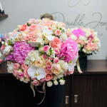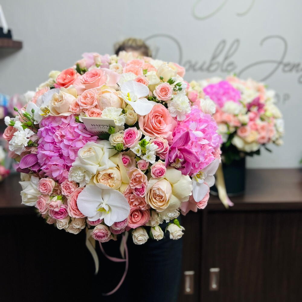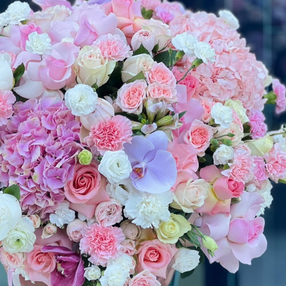 Peony rose - 10 шт. Spray rose - 20 шт. Hydrangea - 7 шт. carnation - 40 шт. одна роза - 50 шт. головка орхидеи фаленопсис - 5 шт.