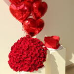 Красные розы. Набор: 100 красных премиум-роз, торт с начинкой из красного бархата и воздушные шары в форме сердца