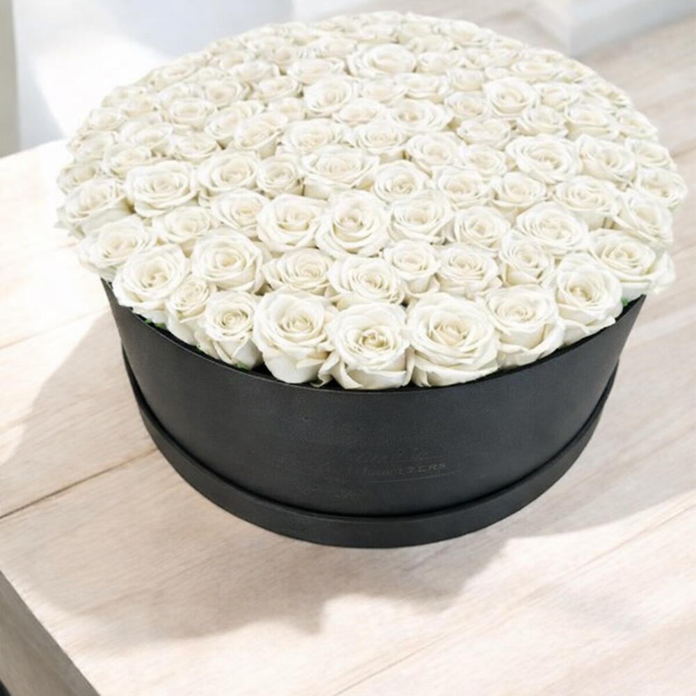 white roses - 100 шт. большая круглая черная коробка - 1 шт.