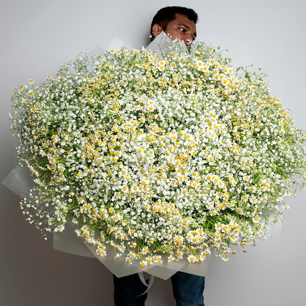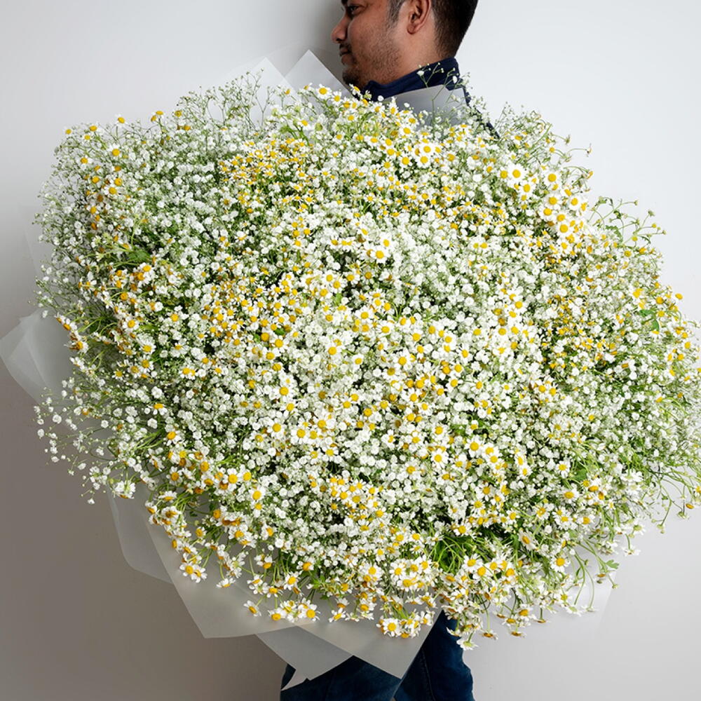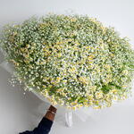 Большой букет из 101 стебля ромашки и 50 стеблей гипсофилы с упаковкой и лентой.