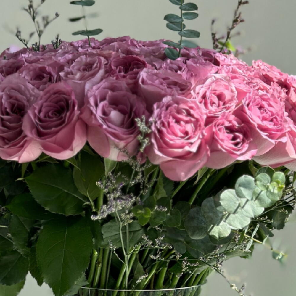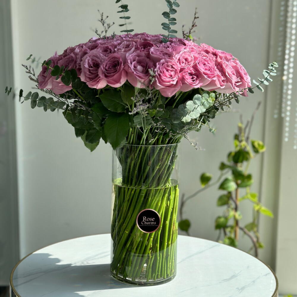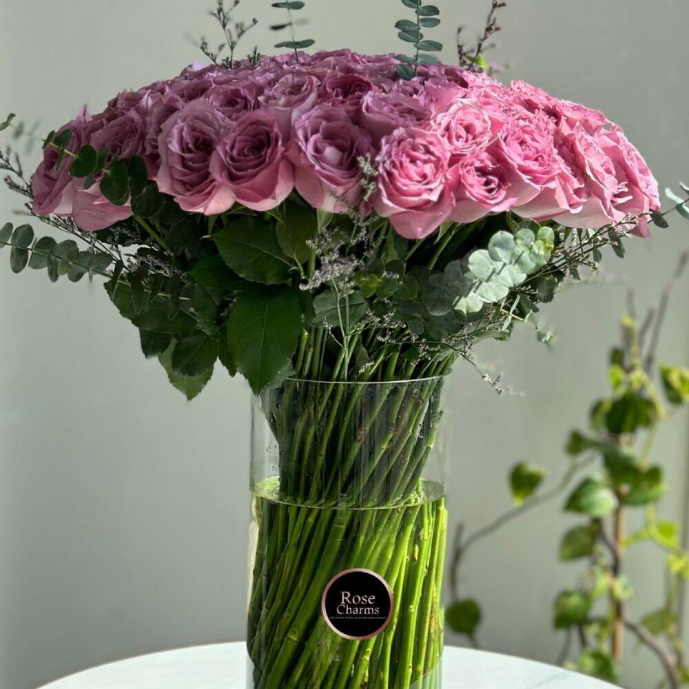 Взгляните на воплощение роскоши и великолепия — нашу грандиозную композицию из 101 величественной тёмно-фиолетовой розы, элегантно представленную в великолепной стеклянной вазе.