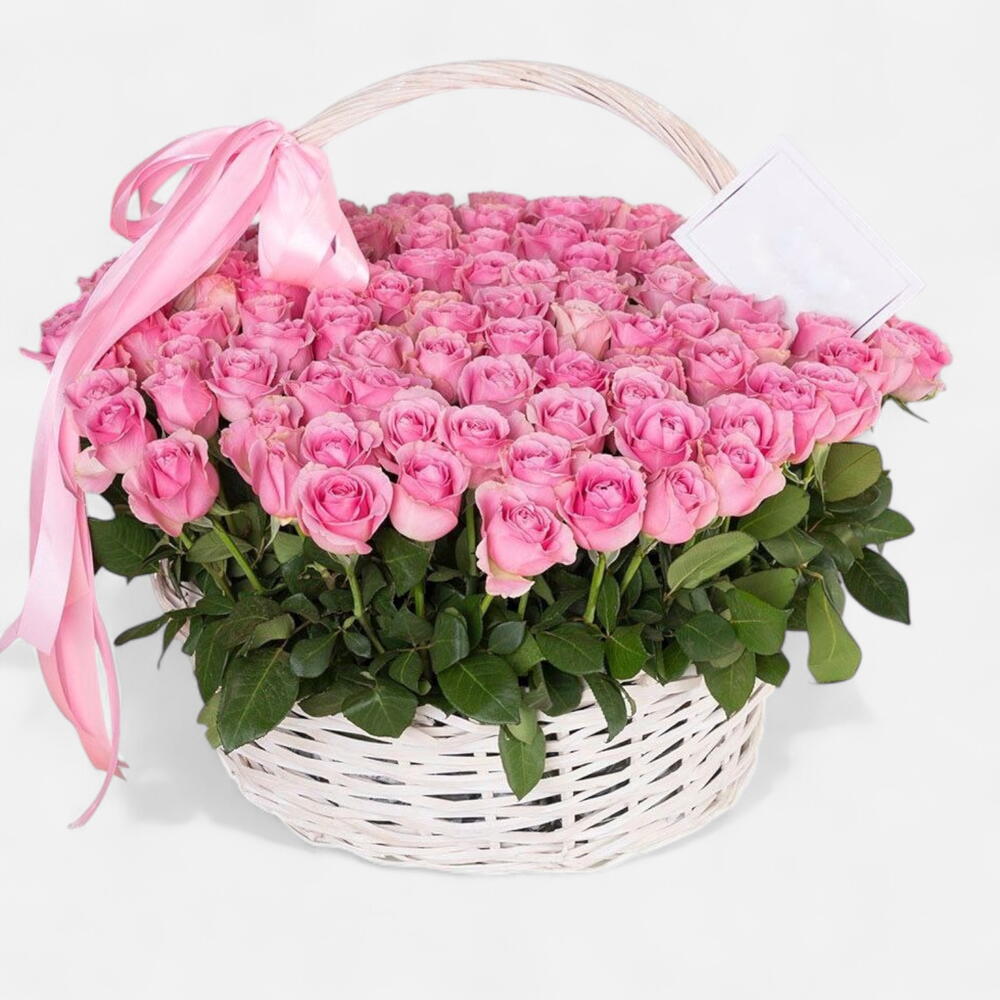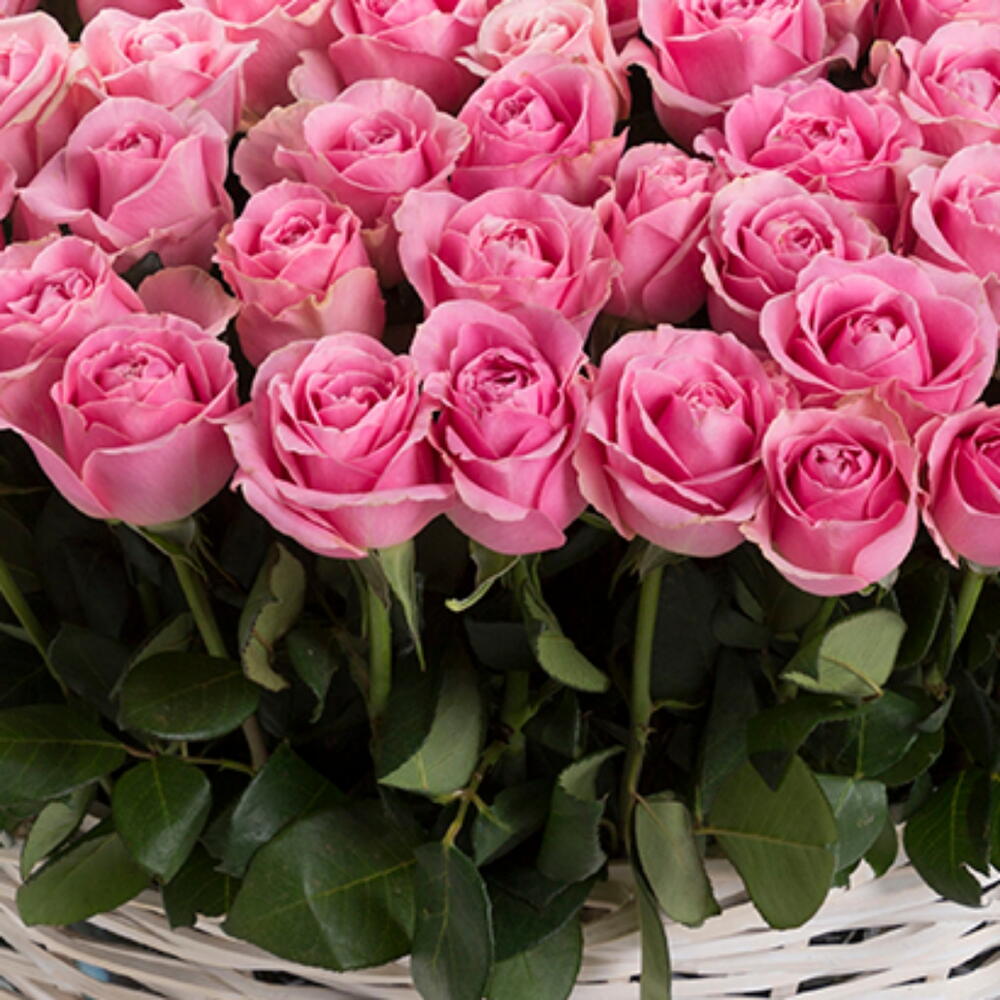 101 роза розового цвета в белой плетёной корзине. Детали композиции: Корзина заполнена до краёв многочисленными ярко-розовыми розами и зелёной листвой. Сбоку корзины завязана розовая атласная лента.